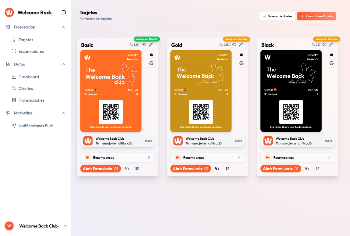 Un programa de loyalty fortalece la relación con tus clientes, impulsa visitas repetidas y te permite recopilar datos valiosos para optimizar tu estrategia. Con Welcome Back, crea una solución sin fricciones, hecha a tu medida y siempre al alcance de tu cliente.